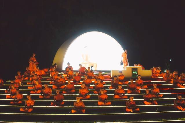差不多六点的样子,会场会统一组织大家进入主会场,按照座位号坐好,两个人两个人坐一起,中间有一个点灯台和两个天灯。会场很大很大,前一个小时是高僧诵经和冥想仪式,晚上八点正式开始准备放天灯,活动刚开始的时候,没有坐满,当时还在担心真的有万人天灯的效果吗,后来在八点前全部坐满啦。