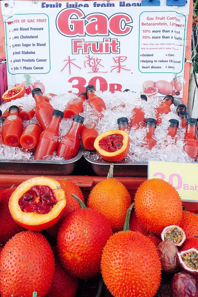 第一次知道这种东西,南瓜大小的橘红色水果,外皮带着刺,切开里面是酒红色浆果样子,据说这个木鳖果对身体特别好,所以果汁的价格也相对贵一点。果汁的味道有点像百香果,比较偏酸,喜欢喝酸的话会很喜欢。