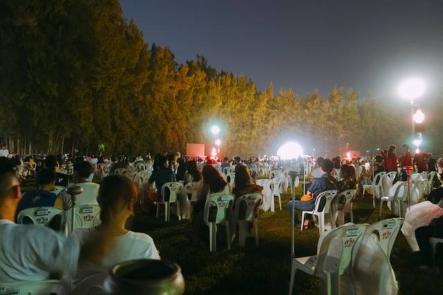 诺大的场地里,树荫下摆满了凉席和蒲团,拿了食物的客人就可以随便找地方坐着,看着表演吃着美食,等着天黑后进入正式的天灯节活动现场。