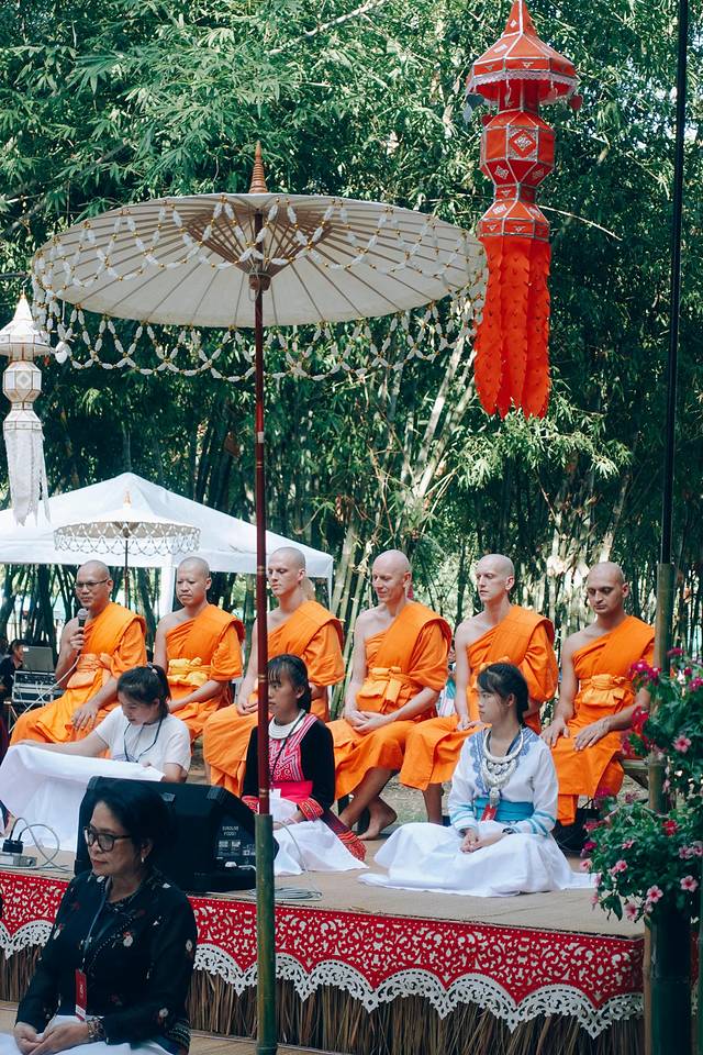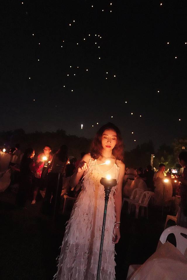 注意!!因为是有高僧的严肃活动,进场和下午茶歇表演的时候会要求穿吊带和短裤的租一个披肩和裤子,不过后面放天灯的时候高僧离的很远,想要穿漂亮裙子拍照的话,可以快快脱下来拍几张然后再披上,总之,记得在高僧面前一定要按要求穿着,是对他们的尊重。其实最好的是穿一个不是吊带的长裙,好看又不用那么麻烦的披肩。我和小伙伴就没有提前了解清楚,穿了吊带裙,于是全程裹着棉质披肩,在炎热的夏天真的要热死了。