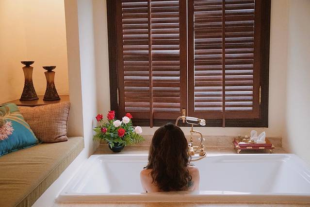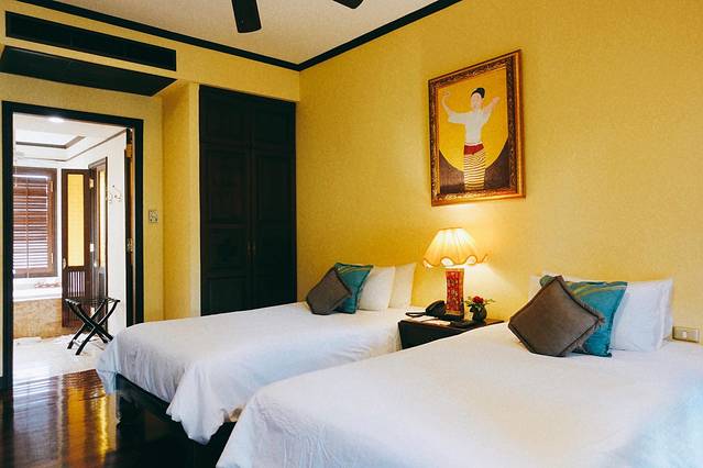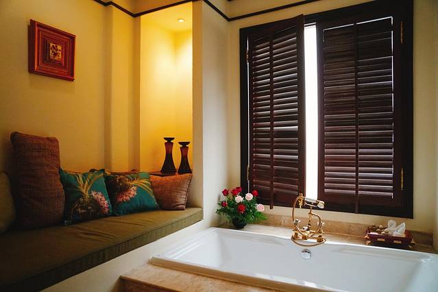 酒店只有三十间客房,每一间都是曾经古老纳兰(Lanna Style)文化的博物馆,房间里的灯都是用的暖橘色,最赞的是洗手间区域,百叶窗前是一个很大的浴缸,在温暖的灯光下泡一个澡真的超享受的!