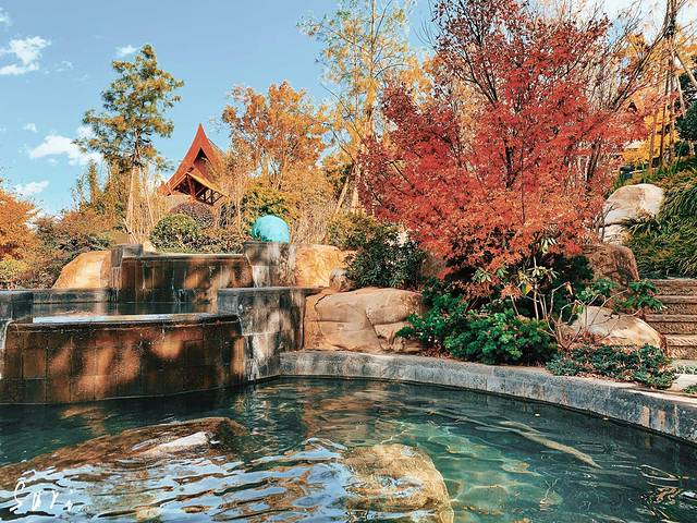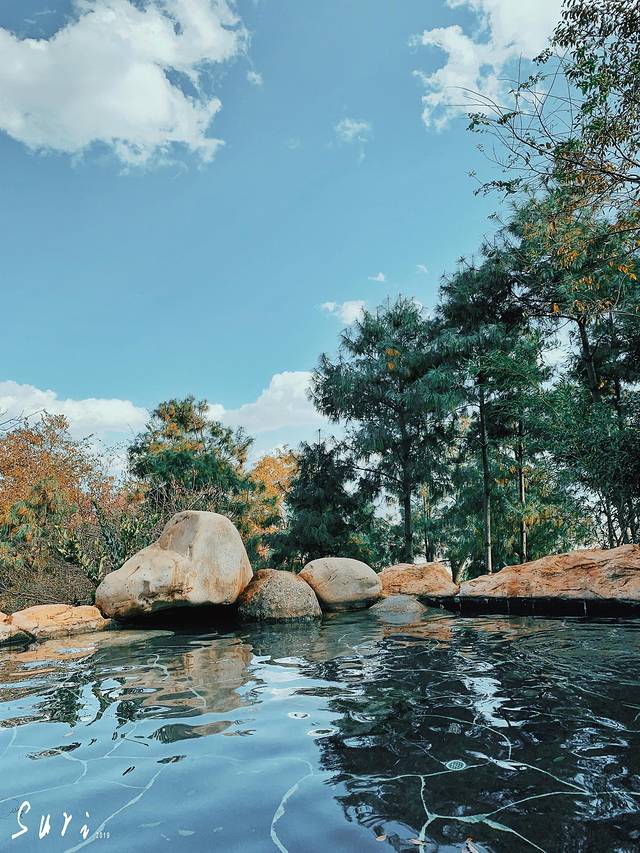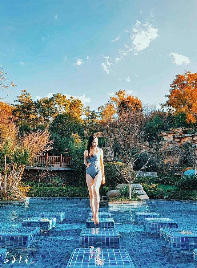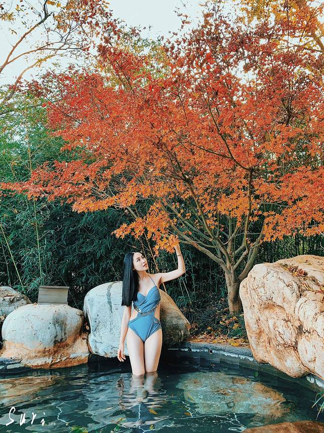 古滇温泉山庄依山而建,仿佛置身山林之间,昆明神奇的气候,十二月温度如春,却有红叶作伴,在好几个温泉池旁都有红枫,其中推荐“瀛洲池”,视野开阔,一秒拍出日本京都泡汤照。