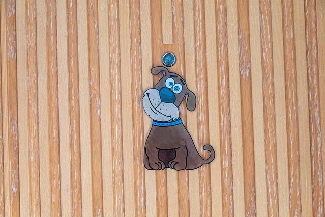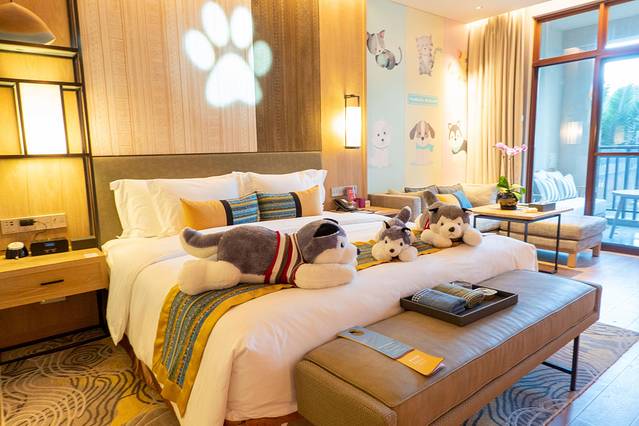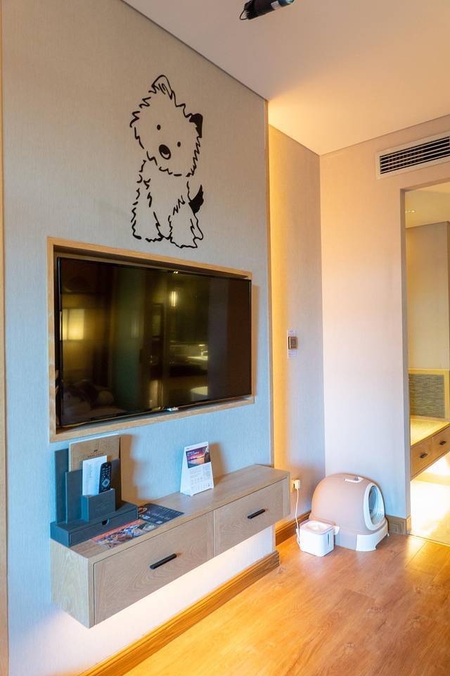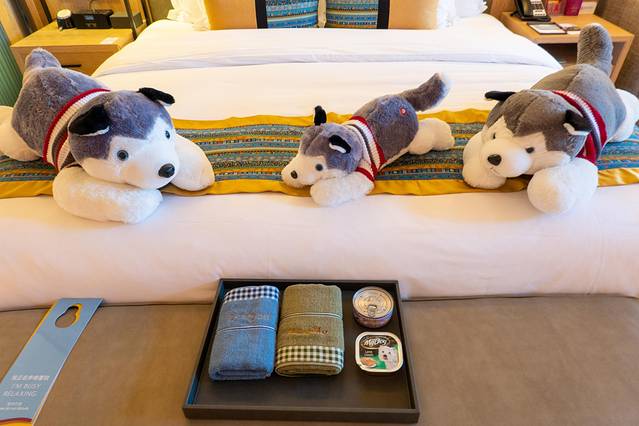 门上的汪星人标志一目了然,小肉爪投影映入眼帘,自动喂水机、厕所、沙发、罐头、还有可带走的酒店为宠物特别准备的绣上名字的毛巾。