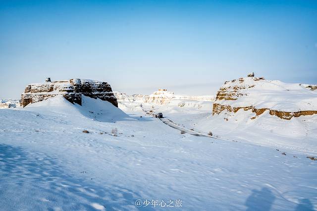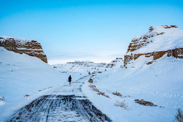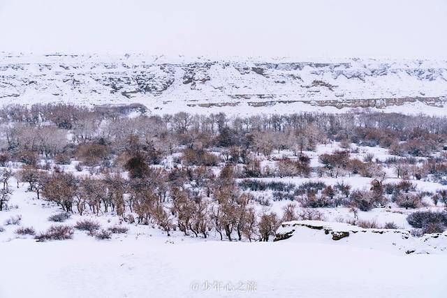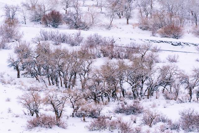 平地上的胡杨林算是见识到了,但峡谷中的胡杨林还是第一次见到,蜿蜒约30千米的白杨河大峡谷,被厚厚的白雪覆盖得仅剩简单的线条,如水墨丹青般的中国风山水画,凛冽的寒风中,竟有几分诗情画意之美。