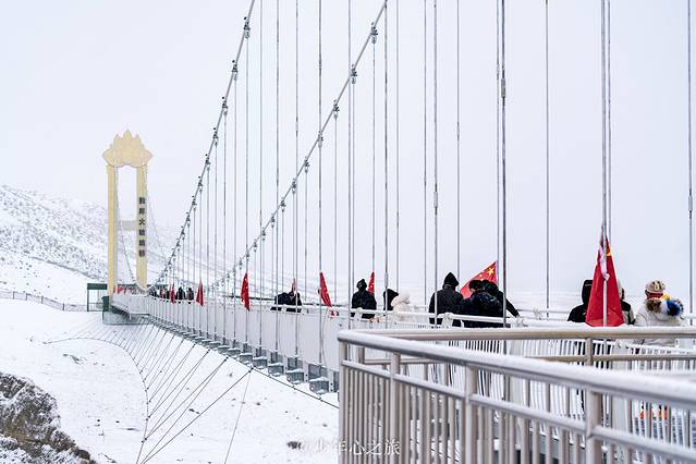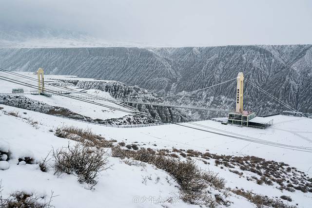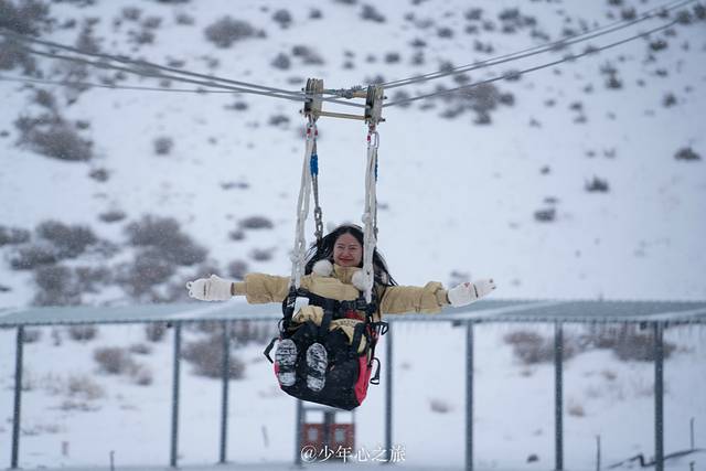 初遇大峡谷还是挺惊艳的,刚劲有力的山脉线条,如一幅巨大的画卷映入我们的眼帘,两边200米的垂直落差,让峡谷显得更为的巍巍壮观,相比之下,悬崖边的观景长廊显得尤为的渺小,仿佛一不小心就会跌落到谷底,看着让人心惊胆战。走到峡谷边缘有两种方式,一种是沿着山边的栈道走下去,另一种则是乘坐滑索滑下去,我们当然选择了刺激的这种了,张开双臂,和空中飘落的雪花来个亲密接触,不一会的功夫,就到了峡谷边缘了。