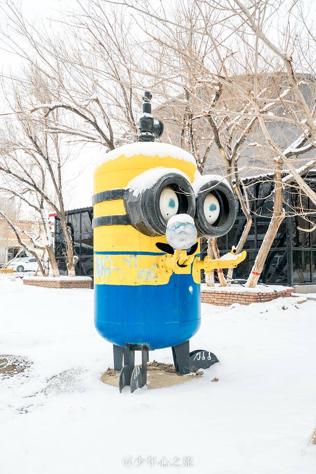 映入我们眼帘的,除了皑皑的白雪之外,还有这些脑洞大开的涂鸦、摆饰品,确实是一个创意园该有的样子,时尚、前卫、适合摆拍,白雪覆盖下的小黄人也别有一番风味,成为了大家争先恐后的合影对象。