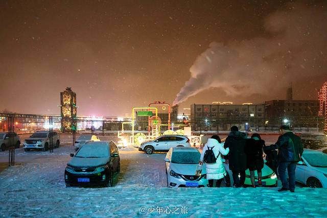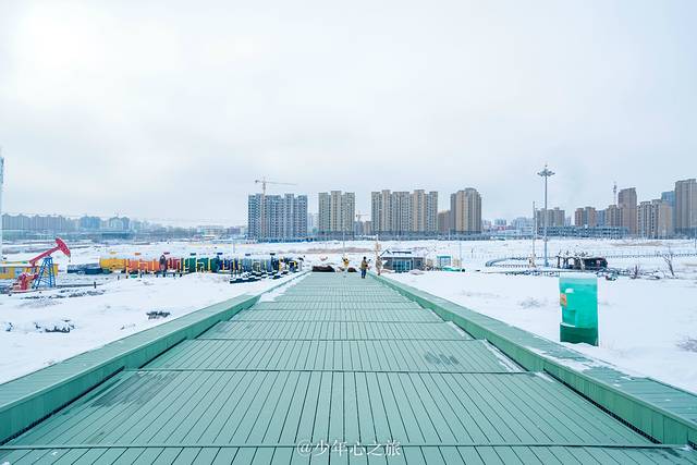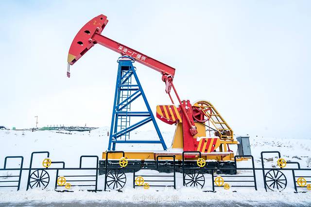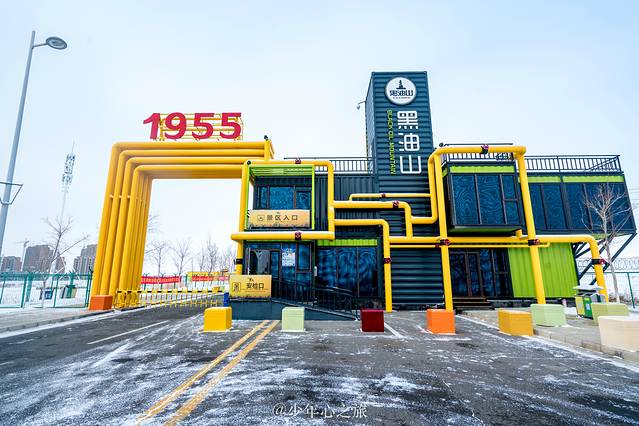 黑油山的大门非常的工业风,一条条黄色的管道集结交织,汇聚成了独特的景区大门,穿过大门,于冰天雪地里,见到了各种探测石油的设备,五颜六色的色彩,形成了一道亮丽的风景线。