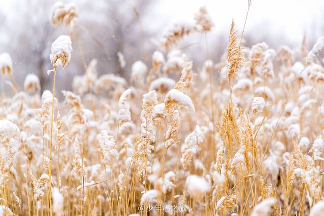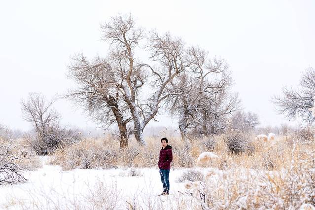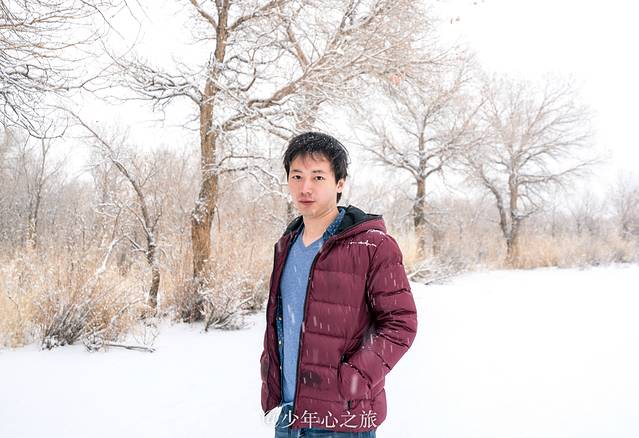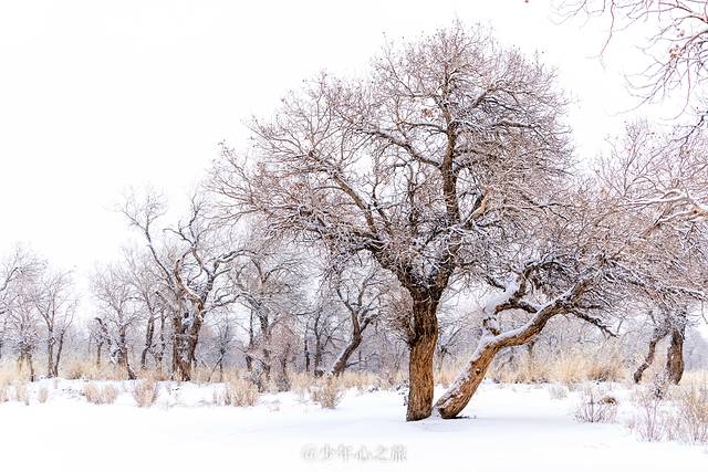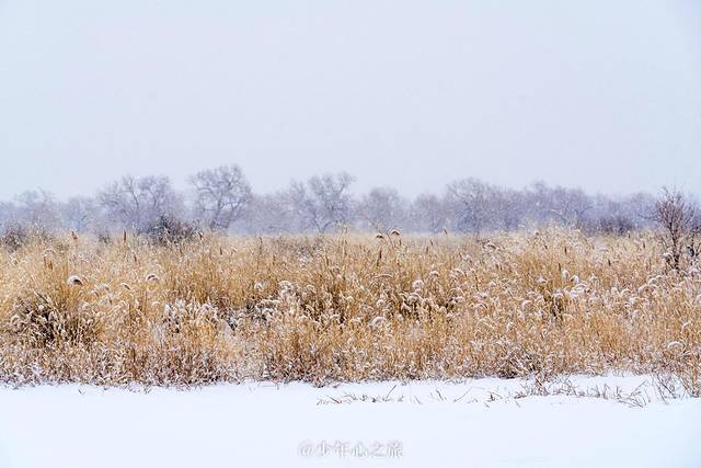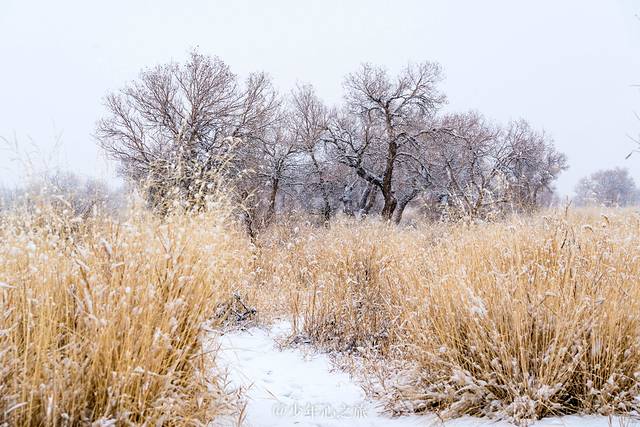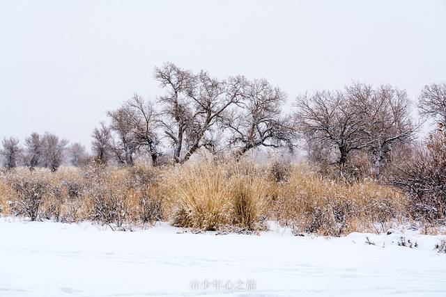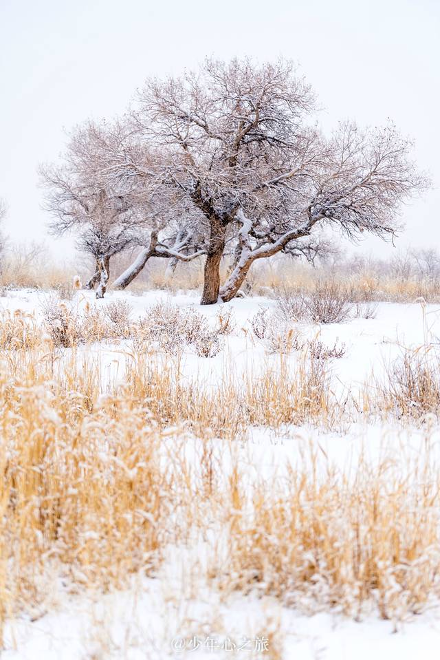 寒风凛冽,大雪纷飞,但已经阻止不了我们前进的步伐,下车之后,一个个像小孩子一样,奔跑在这洁白无瑕的雪地上,这是这几天来见过的最大的雪了,雪中的胡杨林,像蒙上了一层白色的纱布,在寒风中若隐若现,虽然有几分的萧条,但依旧坚挺着自己傲人的身姿,而前方黄色的芦苇,在如此恶劣的环境下,风采依旧,成为了这荒蛮大地里最亮丽的风景线。