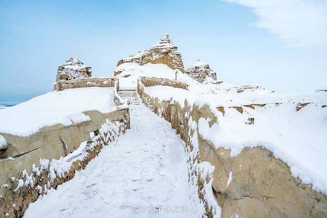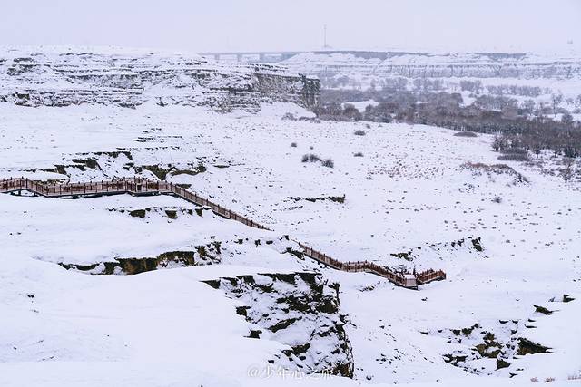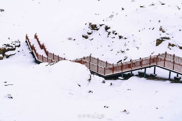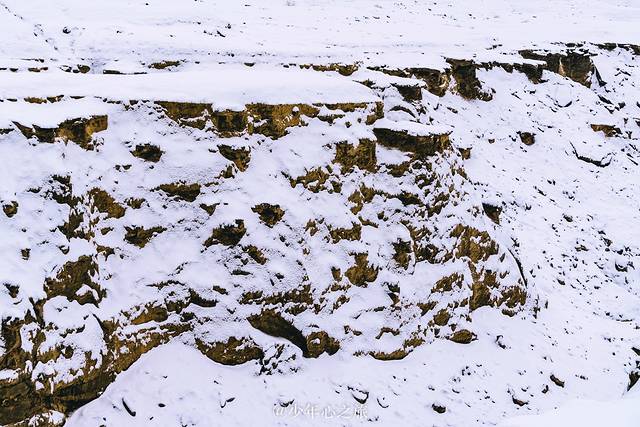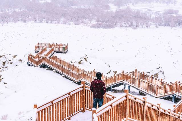 白洋河大峡谷宽约400米,高25米左右,四周是典型的雅丹地貌,冬天没有流水的痕迹,连河面都被大雪覆盖的不见了踪影,一条人工木质阶梯蜿蜒的伸下了谷底,我们沿着峡谷的脉络一路下探,急切地和峡谷来个亲密接触。