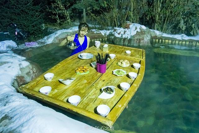温泉泡过不少,但是在雪地里泡温泉,还真的非常少见,没错这里的VIP温泉,一半在室内,一半在室外,可以躲在室内的木屋里,也可以到室外感受冰火两重天的酸爽,边看雪边泡温泉,想想都浪漫。同时还有漂浮在水上的木桌,上面已经备好了美酒佳肴,今天所有的疲惫和酸痛,到这一刻已经烟消云散了,幸福之情早已洋溢在脸上。