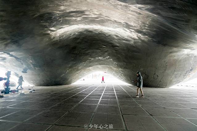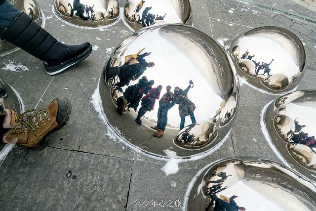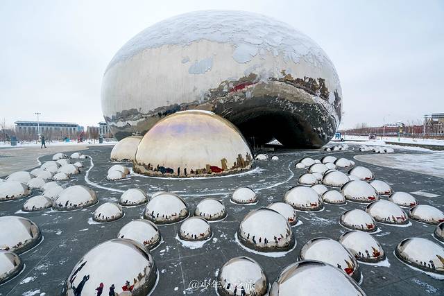 巨大的银色大油泡显得格外的显眼,200多个不锈钢材质的油泡将我们一行人映衬在里面,目光所及之处,都是我们的身影,而牵一发就会动全身,极具喜感,而我们也以这样的方式留下一张张合影。大油泡是为了纪念克一号井而建的,其遗址就在正下方,灵感来源于油池中不断溢出的油泡,设计可谓是别出心裁。