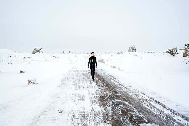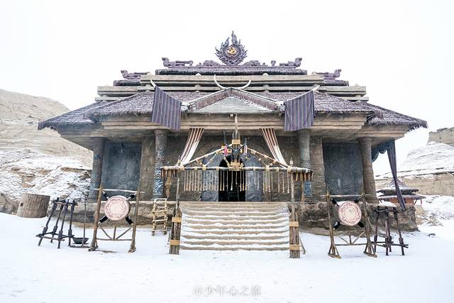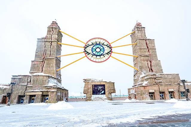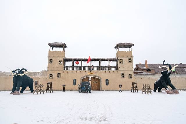 看完黑油山之后,又驱车前往乌尔禾区,乌尔禾最大的亮点,就是世界魔鬼城了,而在魔鬼城的外围,我们邂逅了纪氏部落影视城,一个在雅丹地貌下修建的影视城。这里是电视剧“莽荒纪”的拍摄地,占地面积约8000平方米,门口两只巨型猛犸象在冰雪雪地中显得格外的亮眼,守护着这高高的城墙。