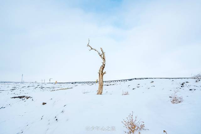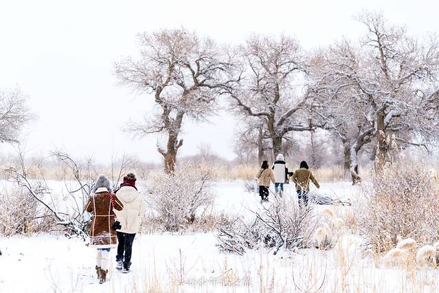 枯木、芦苇、白雪,随手一拍,都是一幅美丽的画卷,尽管天寒地冻,我们的小伙伴也要脱下厚厚的外衣,要风度不要温度地在这一片土地上留个纪念,风雪中的姑娘,在如此美丽环境的映衬下,显得楚楚动人,温馨而浪漫,冬季的胡杨林,也是出唯美人像大片的好地方。