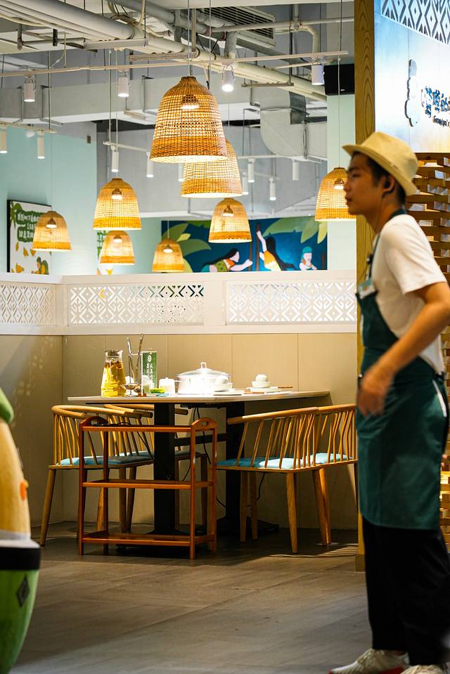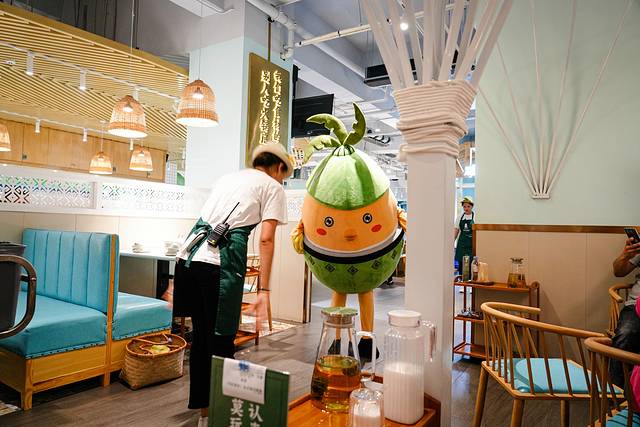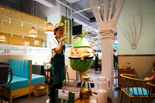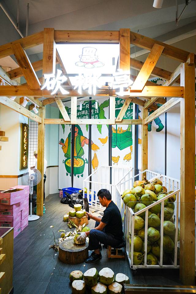 店里的装潢是亚热带风情,多出绿色植物也展示了海南的地区风貌。台面上,整齐划一的摆放着一排椰子,与这家店的特色遥相呼应。往里走,便有一处是开椰子的区域,地上摆放了无数的椰子,有几位工人,正在地上熟练的开椰子,这令我们这些外乡人着实开了眼,是一个极其新鲜的经历。