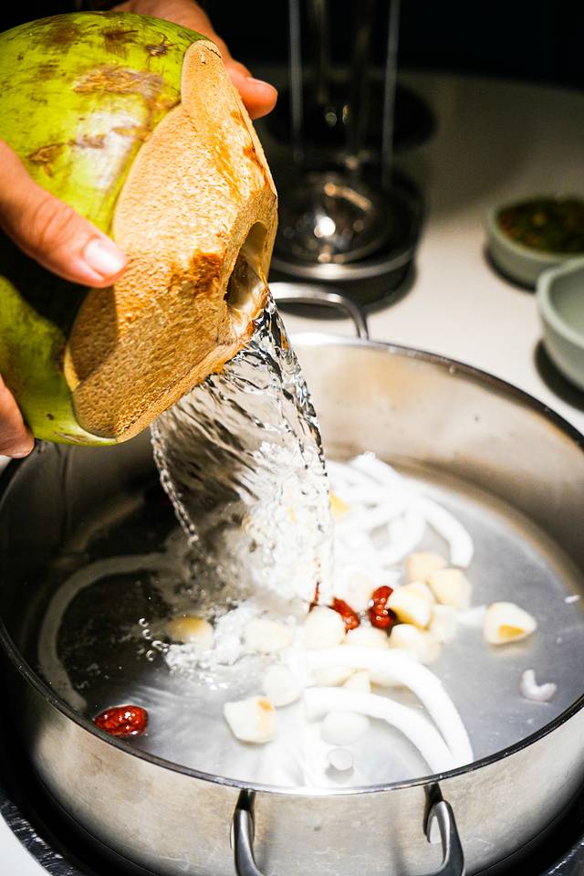 所谓的海南火锅,就是一个大锅里放三颗椰子的汁水,加入各色香料作为锅底。放入据说是,店家精挑细选的文昌鸡一起沸煮。煮出来的鸡肉,肉质鲜美,甜而不腻。入口鲜滑多汁,进肚后,口腔还留有回甘,简直令人回味悠长。本以为吃惯了辛辣的我们会觉得这火锅太甜腻,结果完全被这种特殊的滋味征服了。