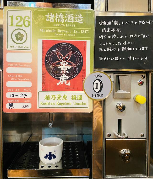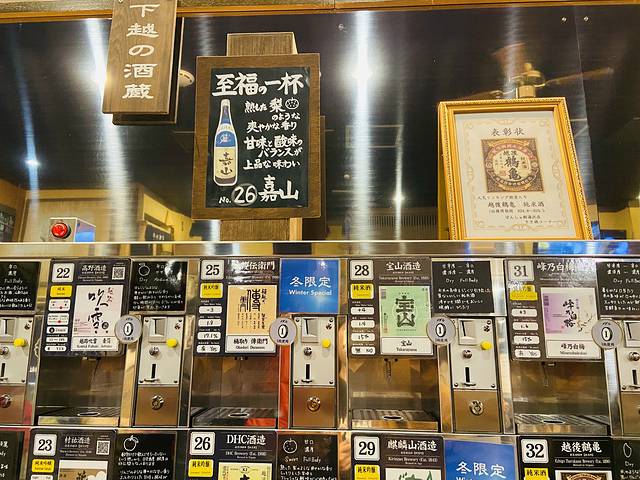 利き酒越乃室,花500日元可以換到5枚硬币和一个小酒杯,可以在店內自行选择想要品尝的酒,不同品种需要的硬币数不同。