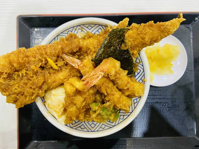 选择了最豪华的江户前天丼,以星鳗、海虾、鱿鱼、半熟鸡蛋、绿椒、海苔为主要食材,虽是炸物,但完全不感油腻,鱼虾等不因油炸而被遮盖住本来的鲜味,也很下饭。