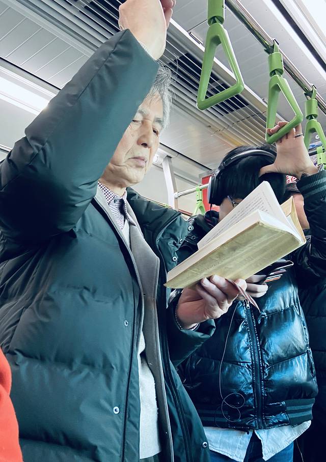 电车上来一白发老者,按中国人的传统美德给他让座,老者却婉拒回答到,他还很“元気”(健康),不需要坐,还拿出一本书读起来,果然元气满满。