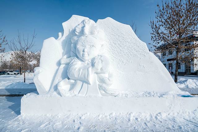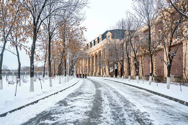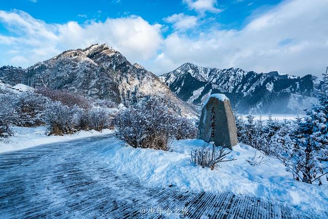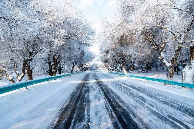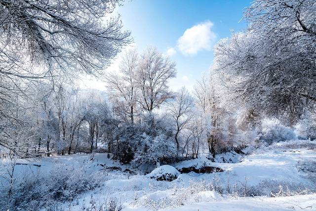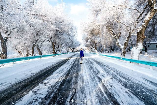 林荫大道一片雪白,树上结满了冰挂,雾凇,配上蓝天白云,一幅绝美的画卷就这样一次次地冲击着我们的视野,恍惚之间,我们仿佛来到了北海道。于是我们急忙让司机停车,给我们预留10分钟的时间拍照,在新疆这几天没少见过雪景,但凭心来说,这是我目前见过的最美的雪景了,突然有点感恩昨夜的那场大雪,让我们的世界变得童话起来。说好的10分钟被我们硬生生拖到了25分钟,尽管司机是否已在催促,还是没能收住我们欣喜若狂的内心。
