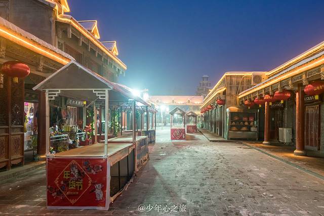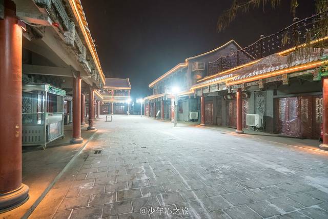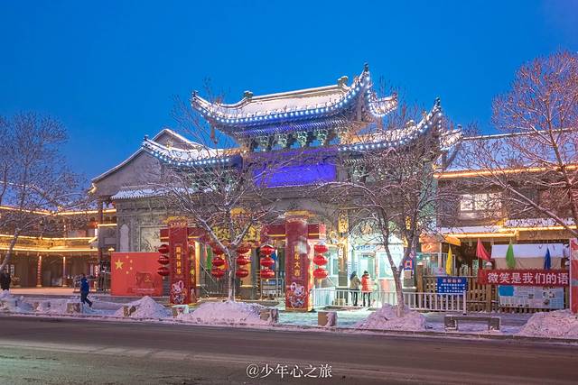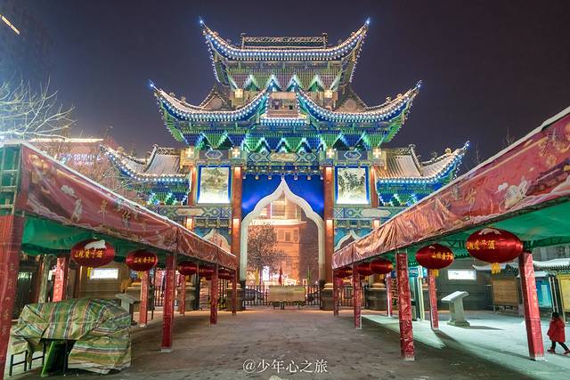 青色和蓝色的砖雕,配上红色的柱子和古典的中国山水画,汇聚成了庄重优美的回民街大门,在橙黄色灯光的点缀之下,显得格外的辉煌壮阔,街内古式古香的建筑让我们很有穿越感,因为天气寒冷的原因,没有见到什么游客,也正因为如此,我们享受到了一个安静祥和的回民街。