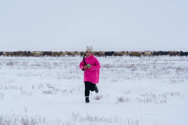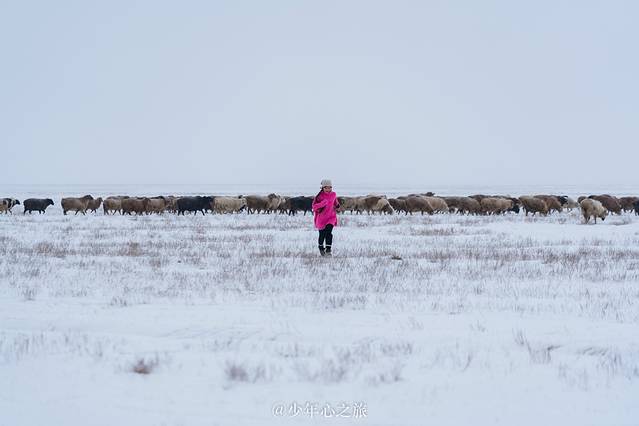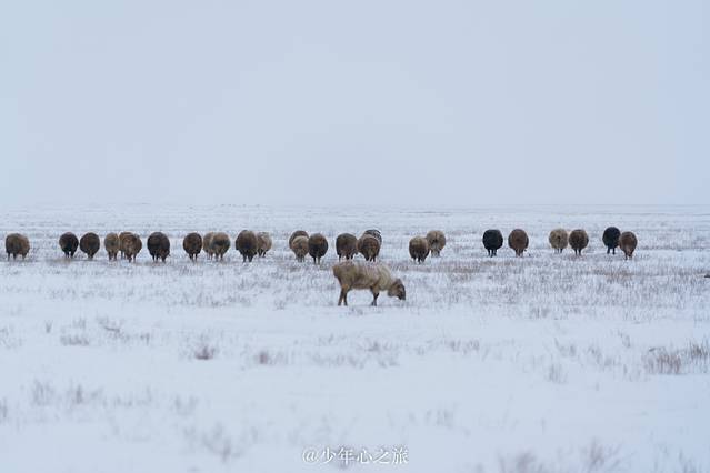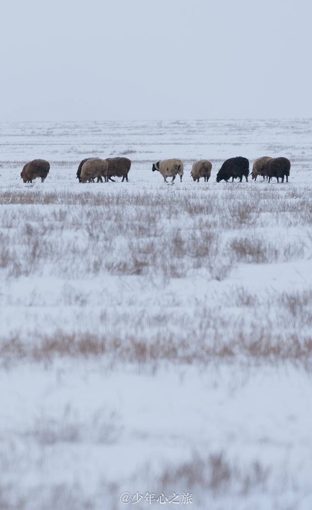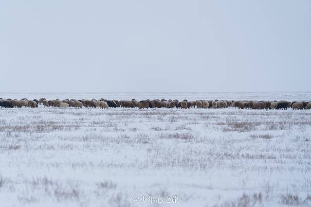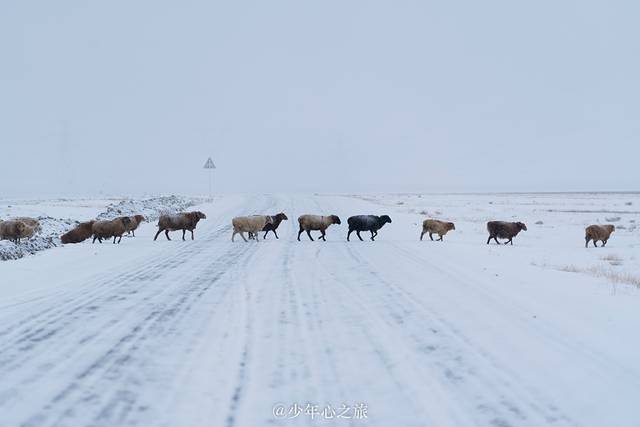 与之前的不一样,我们行驶的这条唯一的马路已经覆盖了白雪,可以想象雪下有多大,天地之间浑然一体,羊群也成为了画面中唯一的色彩,简单而美好。马路的另一侧,一排绵羊正津津有味地吃着草,除了一只羊特立独行侧着身子之外,其他的羊都屁股朝我们,远远的看过去,圆滚滚的极为可爱,让人忍禁不禁。