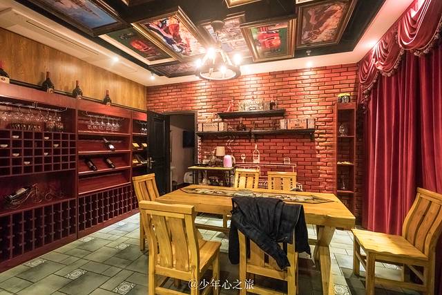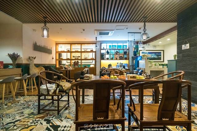 不愧是丝路主题客栈,典雅精致的大厅,摆放的各种书籍、古董,悠闲之时可以坐在大厅看书品茶,值得一看的还有红酒吧,红色的砖头和窗帘,色彩鲜艳浓郁,很有情调氛围,站在门口都可以闻到淡淡的酒香。