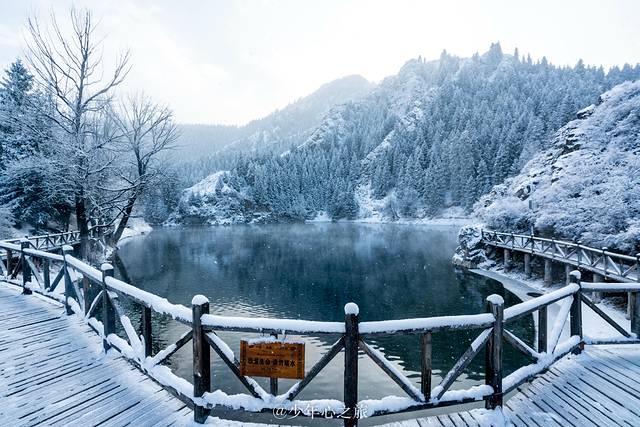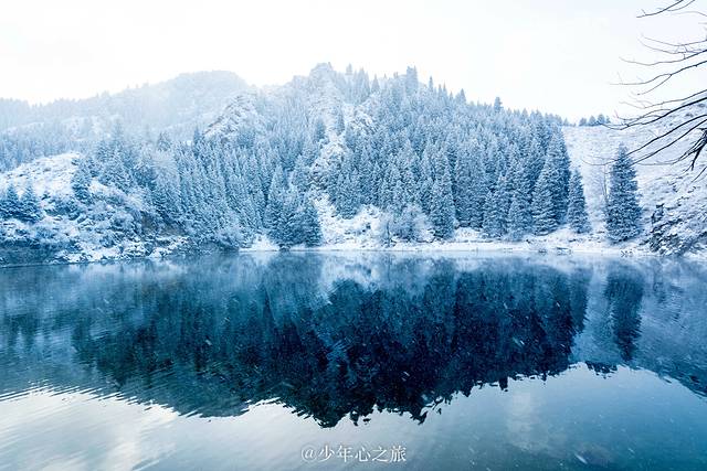 西小天池是行程的第1个点,相传为西王母的洗脚处,来到池边,天空正飘落着小雪,深灰色的湖水倒影着岸边的树木,到处银装素裹,整一中国的山水墨画,美不胜收。