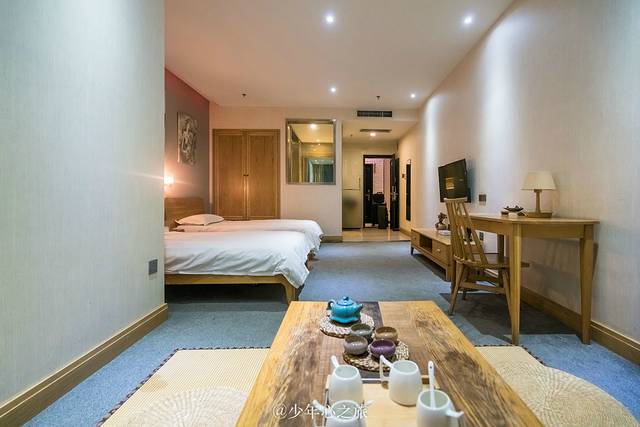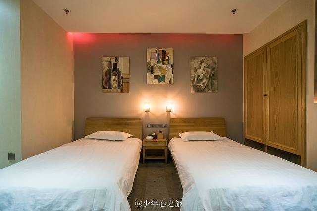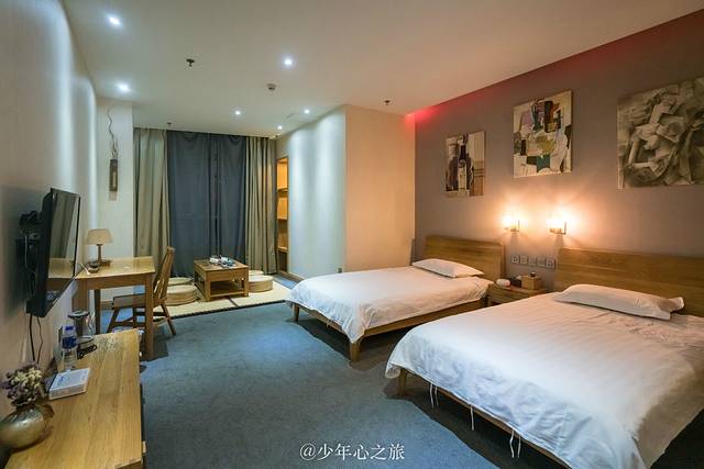 这里有17种风格主题的客房,有电影主题的,有汽车主题的,有丝路主题的,而我们住的是日式主题,宽敞的房间里有个茶几区域,非常适合喜欢泡茶的朋友,房间空间非常的大,两张床一张大书桌,墙上挂了三幅抽象艺术画,风格非常简约,是我喜欢的类型。