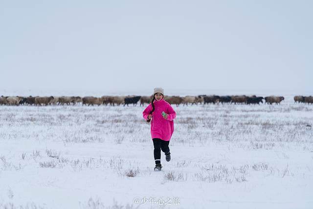 另一次印象深刻的是,路上遇到了一群绵羊,在我们的任性要求下,司机无奈地停下了车,这也是新疆之行第一次看到如此大规模的羊群,冰天雪地里,竟然能看到它们排队过马路,井然有序的样子让我们非常的吃惊和欣喜,一个个换上了长焦就是一顿猛拍。