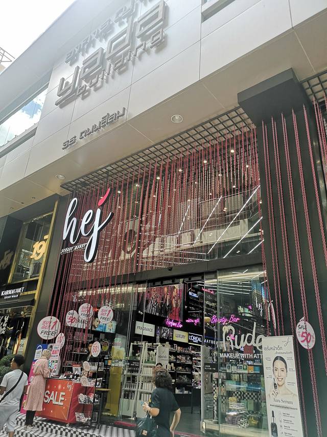 我走上轻轨沙拉铃站(为了过马路),然后去3号出口走下去会看见Hej店。外面很突出,是黑粉色。这个店是很大卖化妆品和护肤品的地方而有许多品牌。听说对国内外很火。回国之前我一定去这个店购物啊。