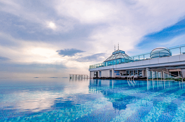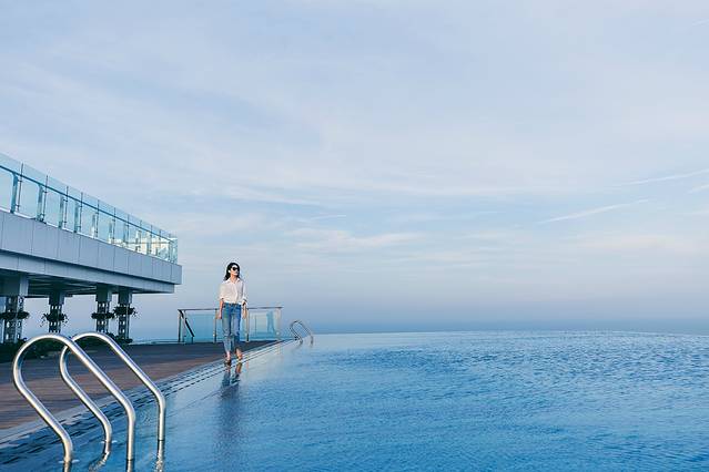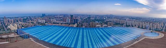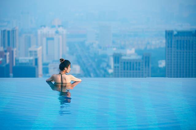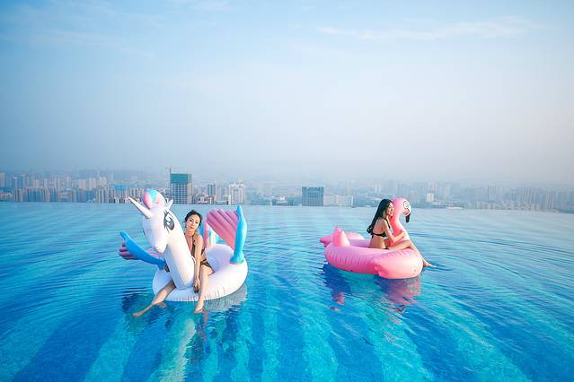 2019年夏天,人生第一次去无边泳池,和闺蜜一起打车到了安泰国际广场楼下,打电话问了一下客服,没一会就有小哥哥带着我们上去了,电梯真的很高,57层没几分钟就到了。楼顶的风景超美的,因为是最高的楼,整个城市的美景尽收眼底。无边际的水面和天空相连,往东面看就是大海,好像我与大自然融合在一体。