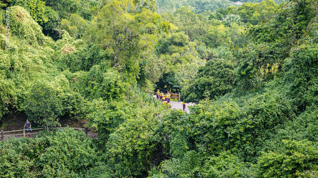 整个地质公园围绕火山口而建,沿着石梯来到海口的制高点,在这可以看到凹陷的火山口,火山口已经被绿植覆盖,一眼望去全是热带植被。