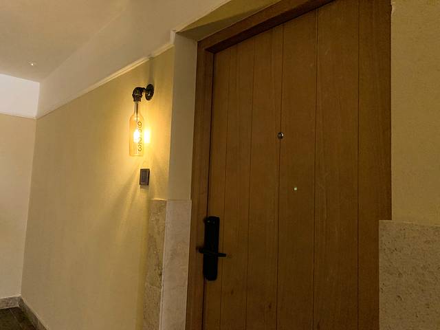 木门、乳墙、暖黄的玻璃瓶门牌更偏于民宿感,散发着古朴的气息