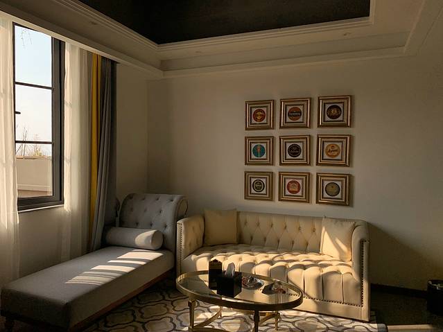 基础的黄灰色布满着窗帘、沙发与地毯,墙上挂着世界各地的酒标