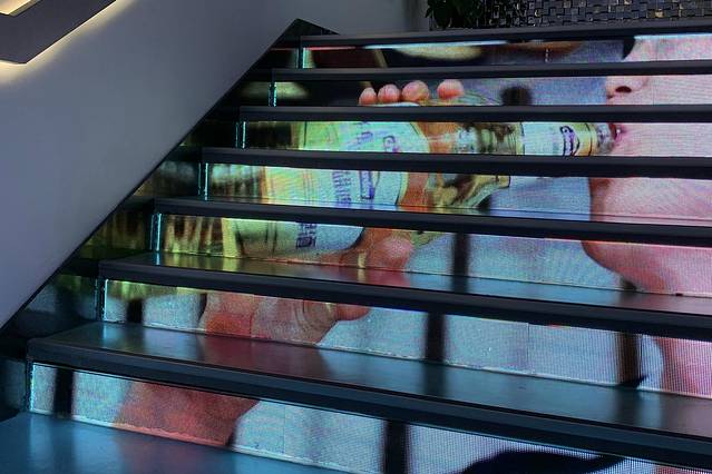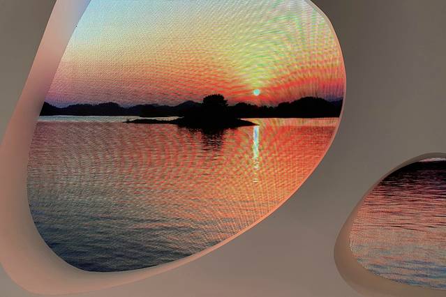 气泡勾勒出夕阳下的千岛湖,阶梯上每帧画面组成完整的动态,使人自然的融入整个空间