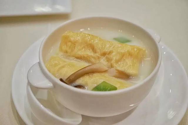 虾仁腐皮卷的汤看似清淡却有浓郁的鲜香,略带嚼劲,腐皮包裹着Q弹的虾仁馅,每一口都是享受。