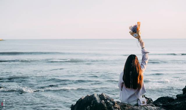 爬上海边的石头,挥舞着干花,拍下一张,孤独的看海照。