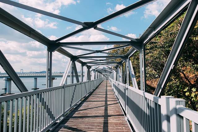 穿过这样的铁桥,就可以到达主桥上了,有阳光的时候,光影的样子真美。