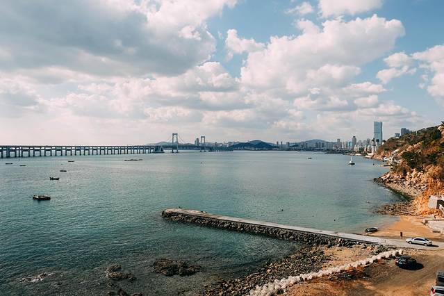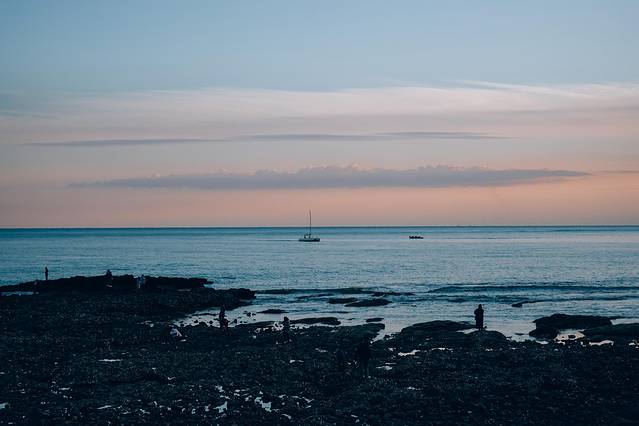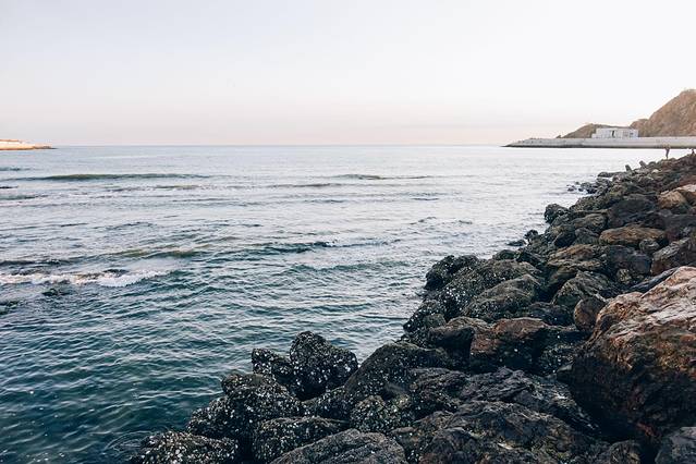 退潮后的堤岸,堆砌的石块裸露了出来。这时候的海边石头,就成了最好的拍照地。从这里望出去,是宽阔无际的海洋,有风的日子里,海水波澜但并不算汹涌。