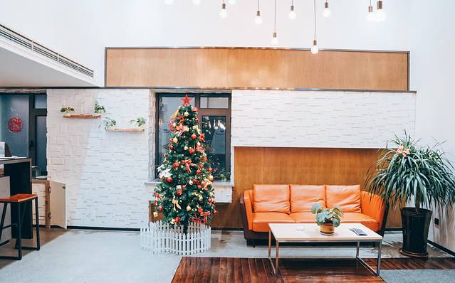 大堂还有一休息区域,一张3人坐沙发,一个茶几,一盆大大的绿植,给这个冬季带来了活力和生气。