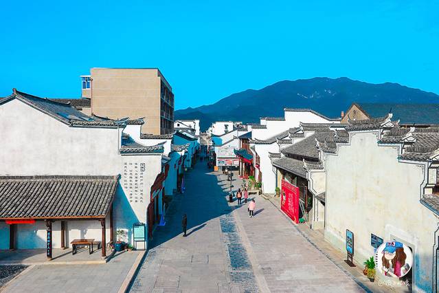 放飞无人机,从高空俯瞰梅城古镇, 白墙黑瓦的古民居古韵尚存,远处新建筑鳞次栉比