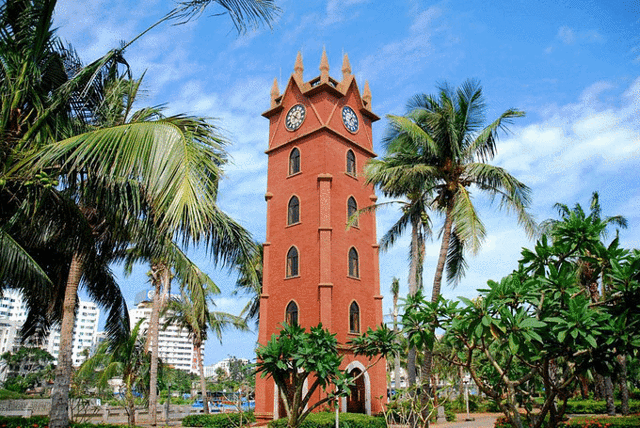 海口 钟楼位于 海口 北部的长堤路,面向入 海口 ,是 海口 市的标志性建筑,也是这个座城市的象征。钟楼始建于1929年,是为适应对外通商由爱国商人周成梅先生发动海外侨胞捐款集资而建,楼高五层,墙体用红砖砌筑,白石灰塞缝,造型幽雅,风姿绰约。