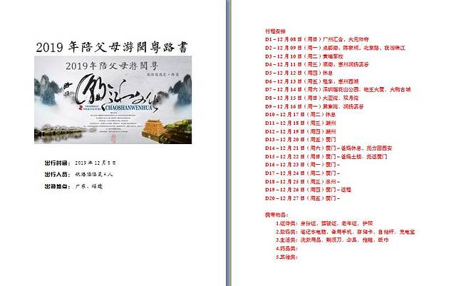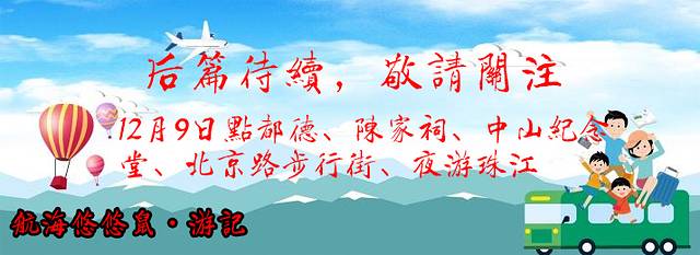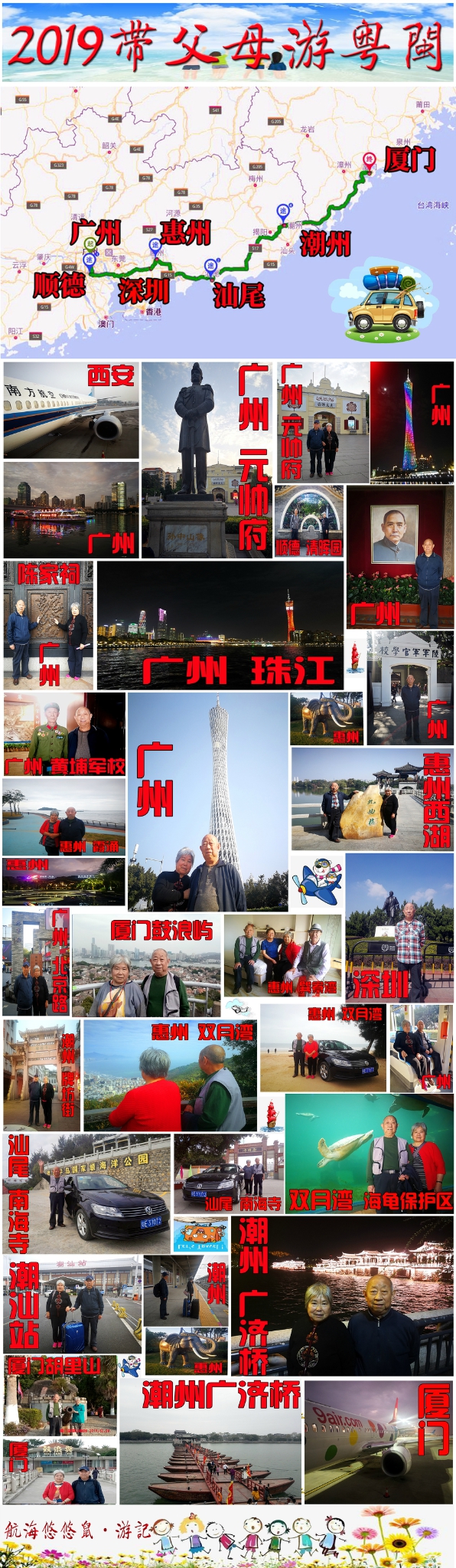 2019年出游继续沿海行,带父母去粤闽。父母在十一月份已前往北海居住,我和太太的假期一直拖到十二月初。12月8日至21日,我和太太带父母走过了广州 、 顺德 、 惠州 、深圳、 汕尾 、潮洲、 厦门等地,历时十四天,共花费15409元。其中,航班、火车、租车、酒店等全部在“去哪儿”预订。在惠州停留期间,第一次租车自驾游五天,带父母游览了惠州西湖、深圳、大鹏古城、双月湾、海龟保护区、平海古城、汕尾南海寺、凤山妈祖等地,行驶766公里。本游记按时间、地点为篇章所写,照片丰富、全程记录,分享精彩旅程~