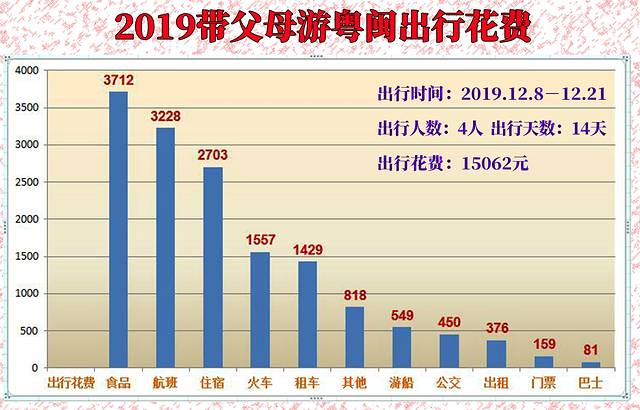 2019年12月8日至21日,出游十四天,期间租车自驾游五天,四人共花费15062元。