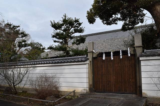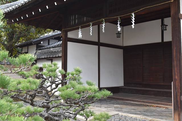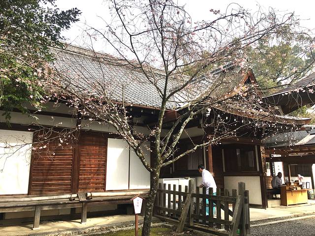 1月17日坐车从神社大门路过,发现已有樱花开放。从金阁寺步行过来约15分钟,大门边果然是盛开了二树粉红的十月樱。十月樱的花期从每年十月至四月,花瓣较小,神社内也有数十株,虽是稀疏、也是在盛放中。
