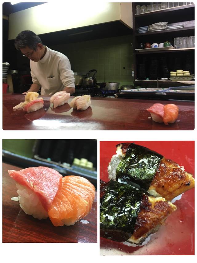 看着邻座的日本人,点了一份定食,厨师把手握寿司做好后直接放料理台上,客人自己用手取吃,一手鱼骨大酱汤碗,一手拿寿司,十分钟吃完结帐。