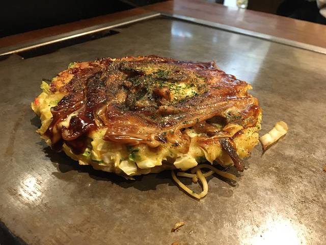 大阪烧里面配料甚多,鱿鱼、猪肉、鸡蛋、菜丝、、、 抹上浓郁的酱汁,最后由食客自行添上紫菜粉、辣椒粉。
