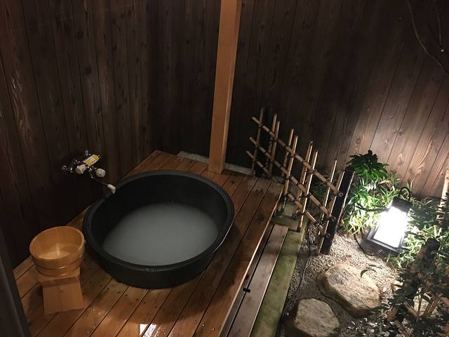 为了体验日本泡汤的习俗,我们买了泡浴用的药液,在浴室冲洗干净后直接走入花园,泡入铁铸浴缸中。花园私密性很高,外面看不见里面情景。