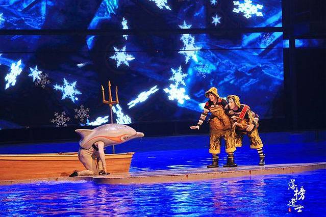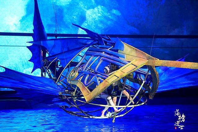 海南首个海陆空3D立体水舞台剧场实现百变场景,中央水舞台的容量破纪录高达7000立方米,相等于4个奥林匹克标准泳池的容量。人们观看演出时,仿佛真的浸入在一片蔚蓝的海洋世界中。