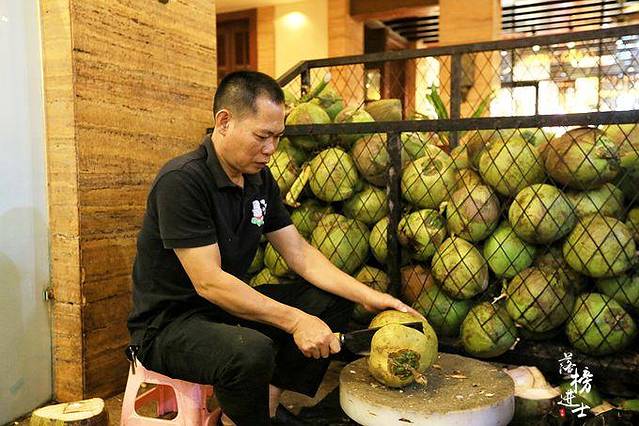 店里椰子都是现砍的,据说每天下来差不多要用300多个椰子。锅底的标准是以三个椰子的椰汁为主,再加入枸杞和新鲜椰肉一起熬制,汤汁格外鲜嫩,尤其是头汤,口味清淡偏甜,鸡肉鲜嫩爽口,是女性专属的养颜汤。